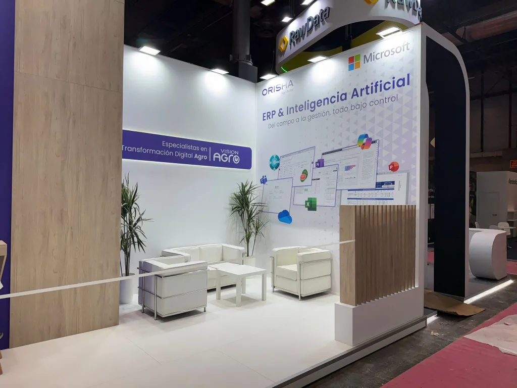 El concepto nace en pantalla, con un diseño que apuesta por líneas limpias, superficies luminosas y una estructura abierta que facilita el flujo de visitantes. Los gráficos en gran formato conectan directamente con el universo agrícola, mientras que la pantalla central actúa como núcleo del stand, mostrando en vivo la potencia de sus herramientas ERP e inteligencia artificial. La combinación de ambos elementos genera un espacio que no solo informa, sino que invita a descubrir cómo la tecnología puede transformar procesos clave del campo a la industria.